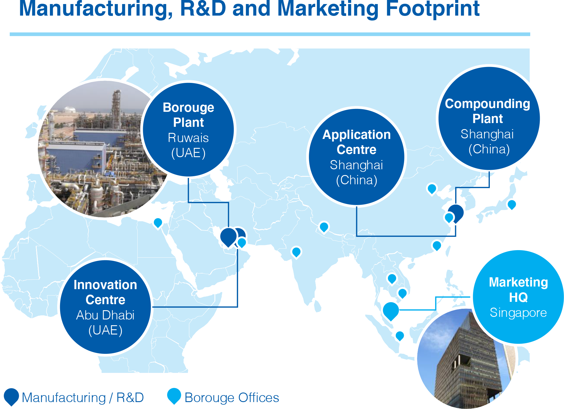 我們在阿聯(lián)酋Al Ruways經(jīng)營著世界上最大的綜合聚烯烴復(fù)合體之一,在中東和北非地區(qū)、歐洲和亞洲擁有不同的物流中心、倉庫和網(wǎng)關(guān)區(qū)域足跡,并在上海擁有一家復(fù)合制造廠(“CMP”)。